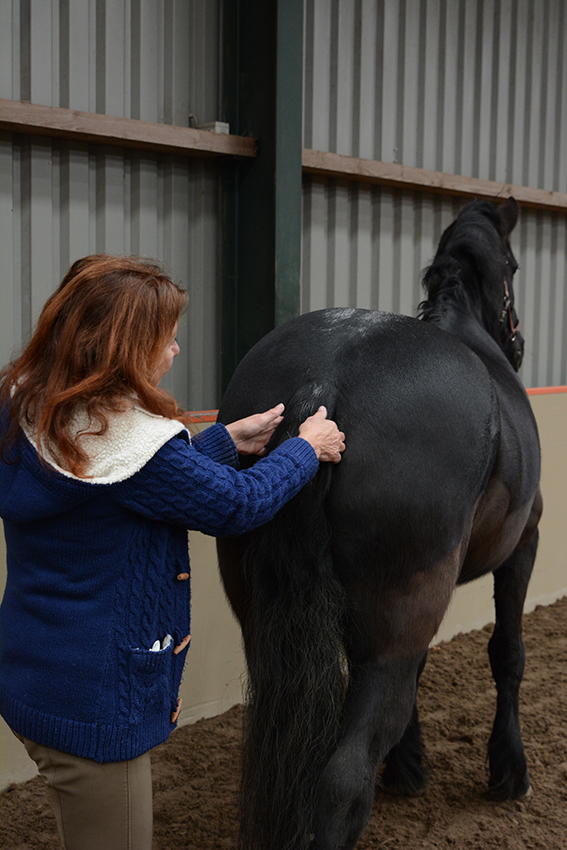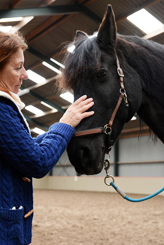 "TTouch is zo leuk omdat je heel snel veranderingen ziet", vertelt Nelleke. Door te touchen bereik je alle hersengolven van het dier en dat heeft direct effect. De Fries op de foto had zijn hoofd hoog, keek boos om zich heen en stampte met zijn achterbenen toen hij net zijn stal uit kwam. Hij was duidelijk 'not amused' dat wij zo brutaal waren hem uit zijn stal te halen. Maar toen ik begon zijn staart te touchen, zag je hem binnen een minuut letterlijk 'inkakken', dat vond hij heerlijk. Tijdens de cursus TTouch Paard ga je samen met je paard ontdekken wat hij leuk en prettig vindt, en daardoor krijg je een betere band met je paard.